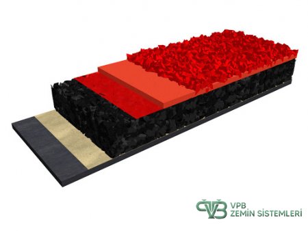 Minimum bakım maliyeti ile maksimum konfor ve performans bir arada sunan sandviç sistem koşu pisti sistemimizin alt tkısmında, geri dönüşüm SBR kullanılmaktadır. Yapıştırıcı (binder) ile karıştırılan SBR granüller, özel makineler ile (finisher) belirli bir kalınlığa ulaşana kadar zemine serilir. Standartları karşılayan kalınlığa ulaşıldığında, gözeneklerin kapanması amacıyla SBR üzerine macun uygulanır ve son katman EPDM için zemin hazır hale getirilir.